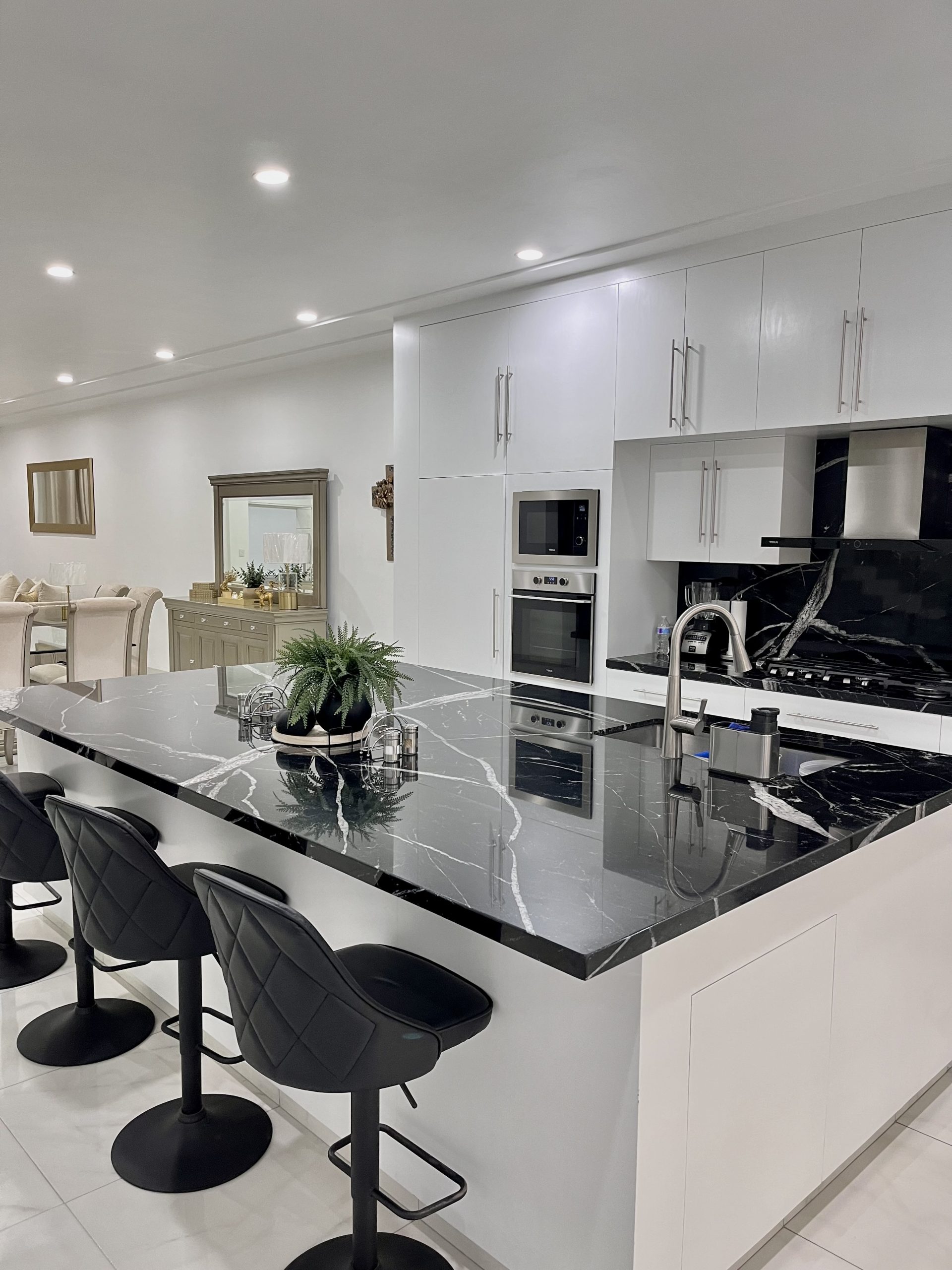 Siente la elegancia de tener una cubierta de cocina con granito negro sky falls combinado con muebles finos de color blanco que contrastan fuertemente dando como resultado una cocina de ensueño .